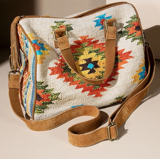 Discover the vibrant charm of this hand-woven Boston bag featuring colorful ethnic patterns. Crafted from yarn-dyed fabric, it boasts a genuine suede handle and strap, complemented by playful tassel accents—perfect for adding a stylish touch to your fall wardrobe.